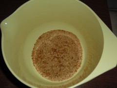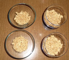 Löffelbisquit fein zerbröseln und mit der Butter zu einem Teig verarbeiten. Den Boden von vier Dessertschalen damit locker auffüllen. Nicht festdrücken! |