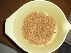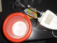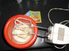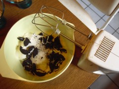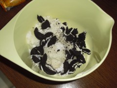 Philadelphia, Quark, 1 Päckchen Vanillin-Zucker, Zucker und 6 gebröselte Oreo-Kekse mixen.