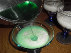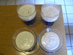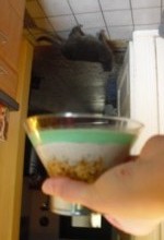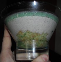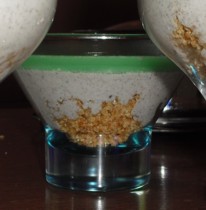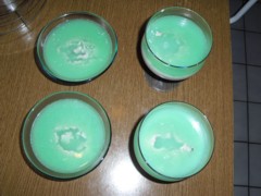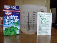Hinweis: Ich habe festgestellt, daß es schon einen Unterschied macht, welche Götterspeise man verwendet. (Zumindest vermute ich, daß es daran liegt.) Zum einen gibt es die Götterspeise, die man im Topf erhitzen muß. Bei einer anderen Sorte übergießt man das Pulver mit heißem Wasser. Der Unterschied bei beiden Versuchen war, daß sich bei der zweiten Variante die Götterspeise bis zum Boden durchgearbeitet hat, während bei der ersten Variante alles in Schichten blieb.