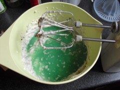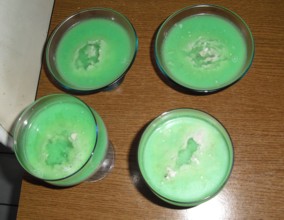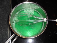 Die Götterspeise (1 Tüte für 500 ccm Wasser) mit 400 ccm Wasser (ohne Zucker) erhitzen. |