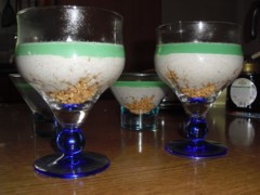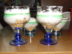 Die zweite Hälfte der Götterspeise vorsichtig auf den Gläsern verteilen. Die Gläser kühl stellen, bis die Götterspeise fest geworden ist.