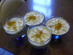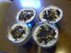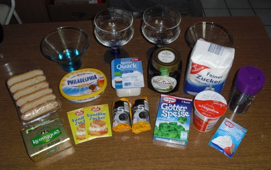 Schlagsahne mit Sahnesteif und einem Päckchen Vanillin-Zucker schlagen und auf den Gläsern verteilen. |