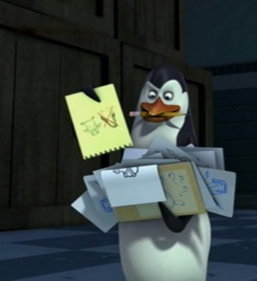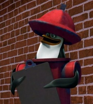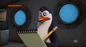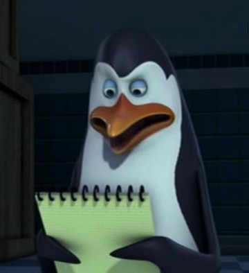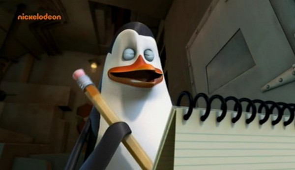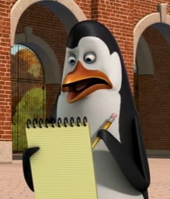 Kowalski hat für alle Fälle seinen Notizblock dabei, als sie Randy aufsuchen. Skipper weißt Kowalski bei der Gelegenheit an, Privates Ansicht darüber, Randys Seite der Geschichte anzuhören, in den Hefter für dumme, naive Fragen zu stecken: