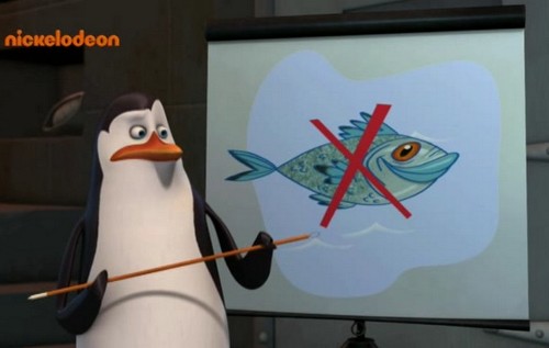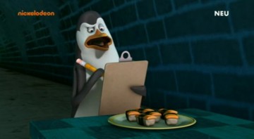 Kowalski erklärt den Nutzen von Fisch: „Wißt ihr, Fisch ist reich an Omega3-Fettsäuren wie Eicosapentaensäure und ihre gescheite Gefährtin, die Docosahexaensäure!” |