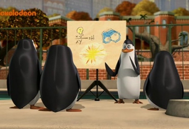 Der Vortrag geht draußen weiter. Kowalski: „Für dieses Experiment stütze ich mich auf drei klassische wissenschaftliche Methoden: Hypothese, Beobachtung, Schluß…” – Hier bricht Skipper den Vortrag ab, worauf Kowalski die Schnellfassung liefert.