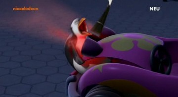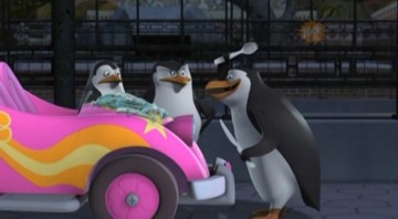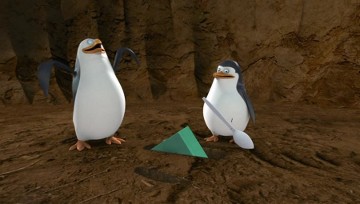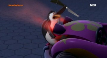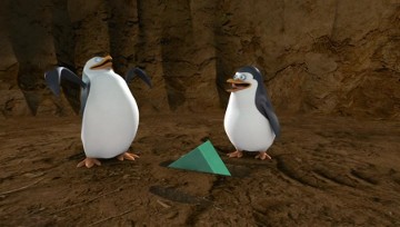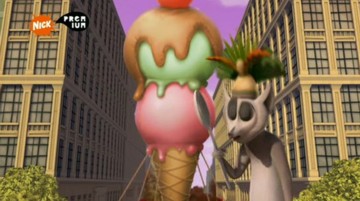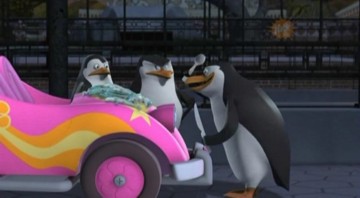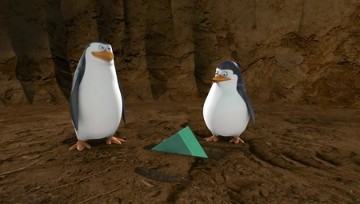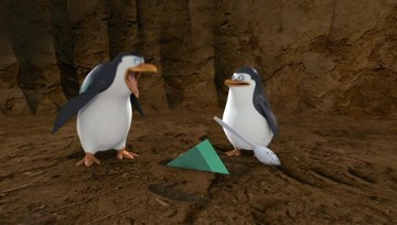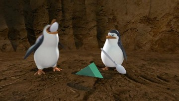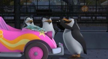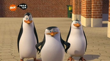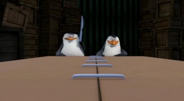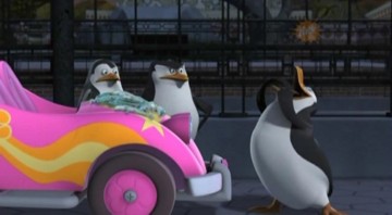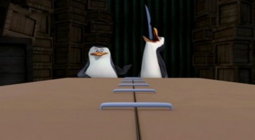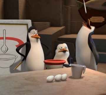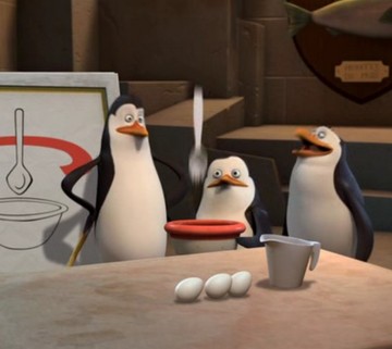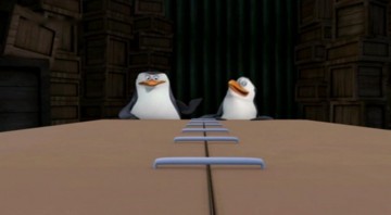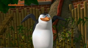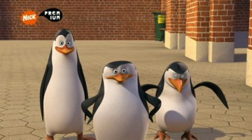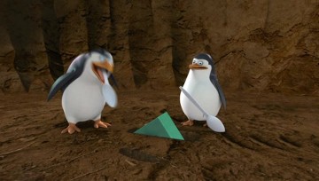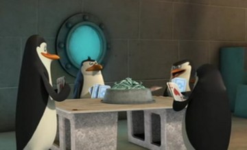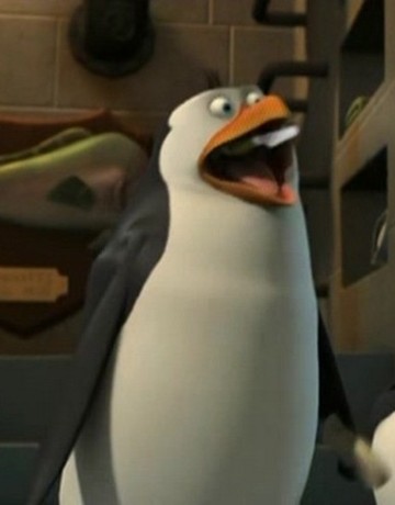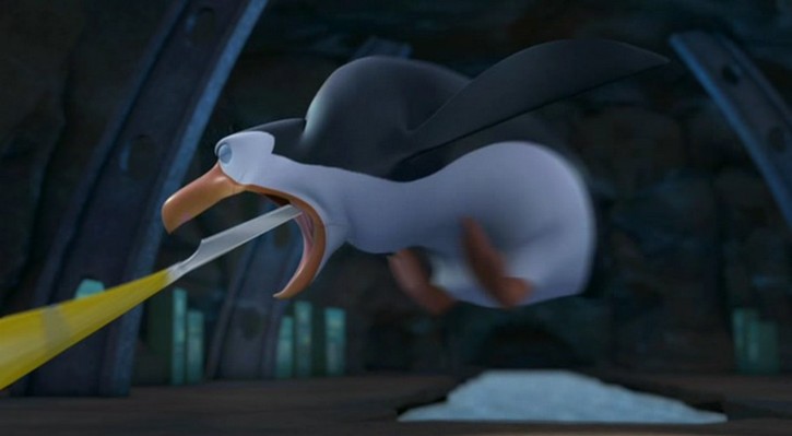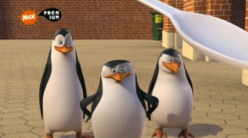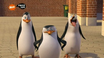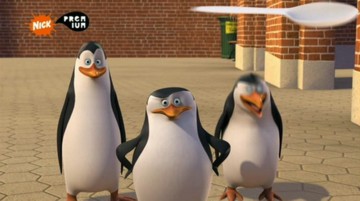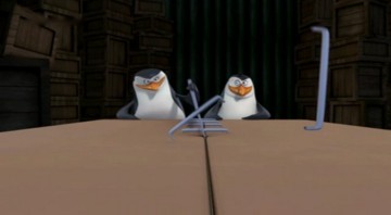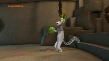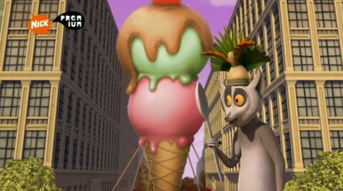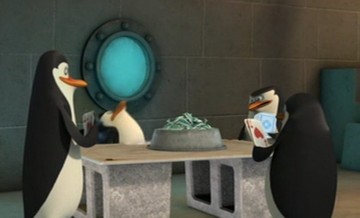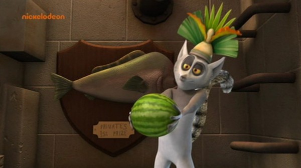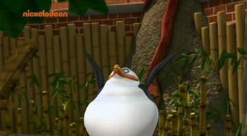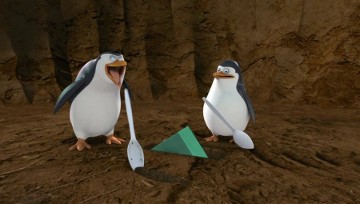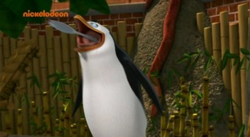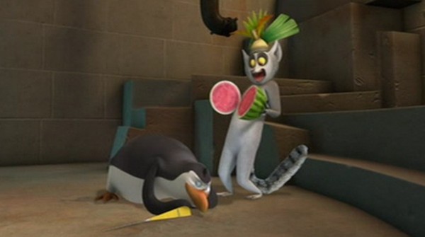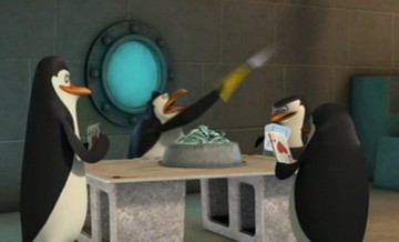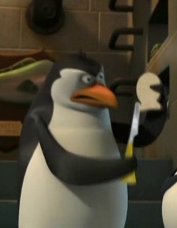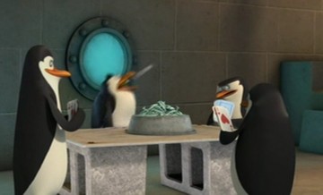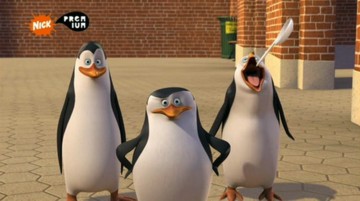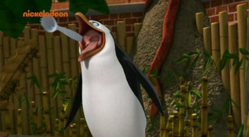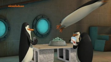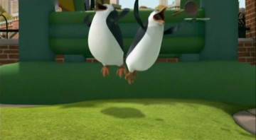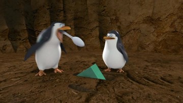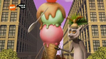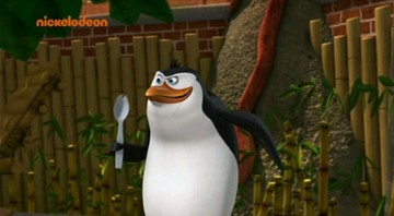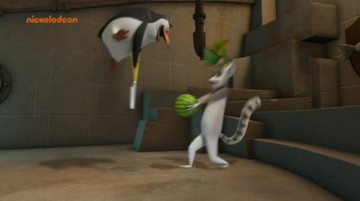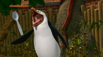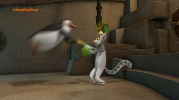 Als Mort die Pinguine gegen die Hüpfburg schleudert, spuckt Rico unter anderem einen Löffel aus: