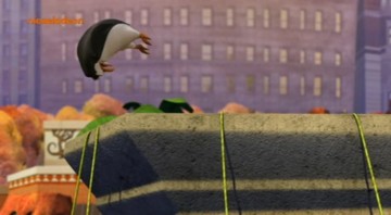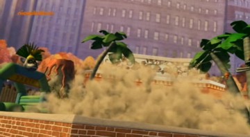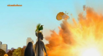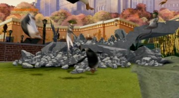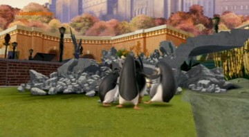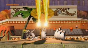 Die Explosion ruft die anderen Pinguine auf den Plan. Skipper: „Rico! Wer hat dir denn die Sprengung dieser Werbetafel gestattet, hä?”