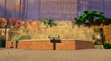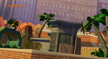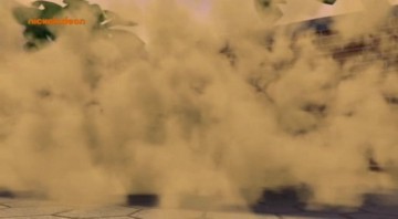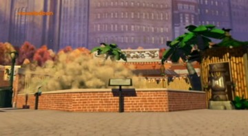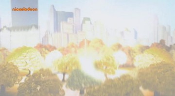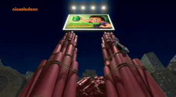Julien: „Die häßliche Werbetafel ist verschwunden, und zwar mit einem mächtigen Rums, haha! Schlag' ein, mein Kaboomi-Freund!”